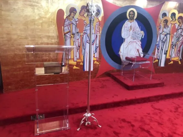 Atril fabricado en metacrilato de 15mm Altura de 1,25mts ; ancho 60cm. Este atril tiene más inclinación en la parte que se pone el libro que el modelo 1