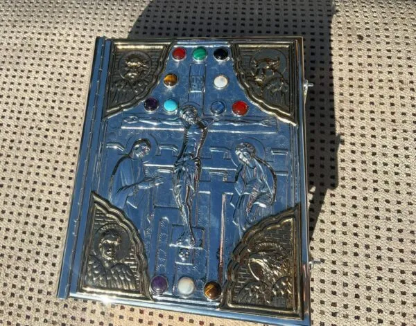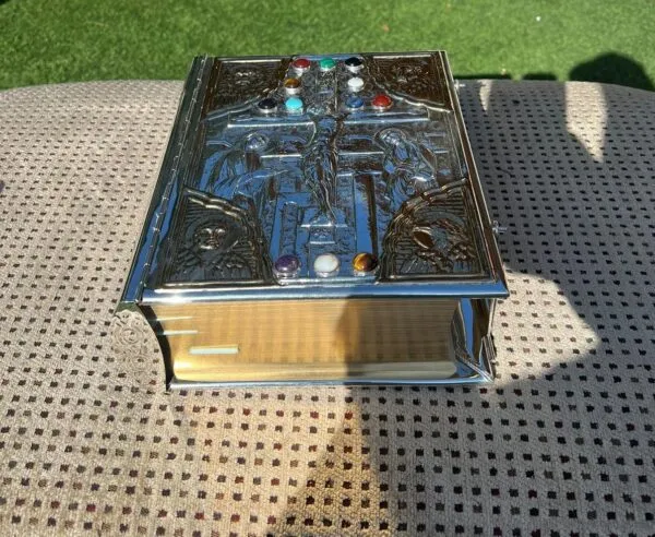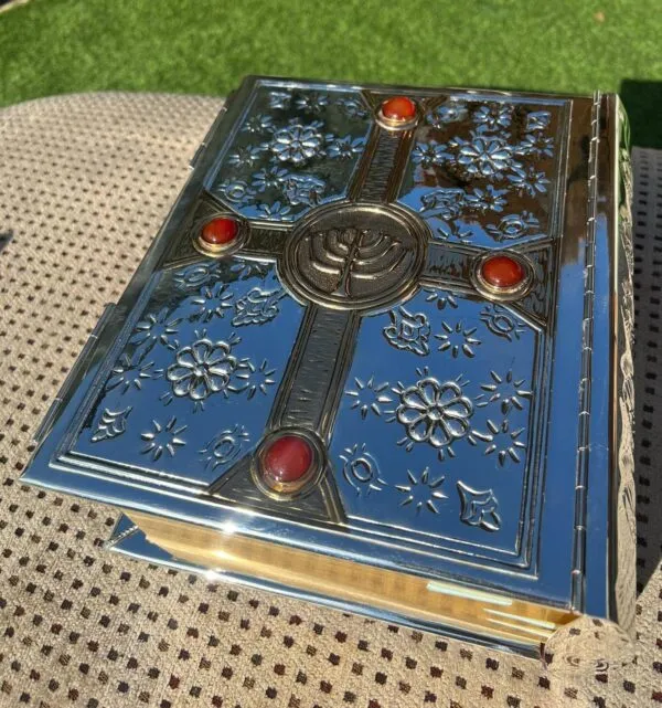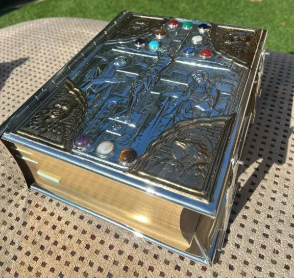 Biblia cincelada a mano en talleres de orfebrería española.