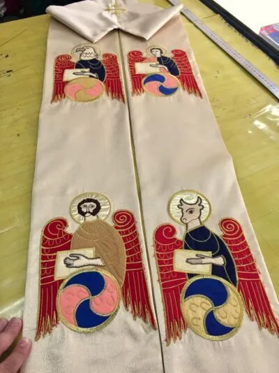 Los evangelistas están asociados con los cuatro seres vivientes descritos en el libro de Apocalipsis: un hombre, un león, un buey y un águila. Estos símbolos son incorporados en el diseño de la estola, lo que le otorga un profundo significado teológico y espiritual.
