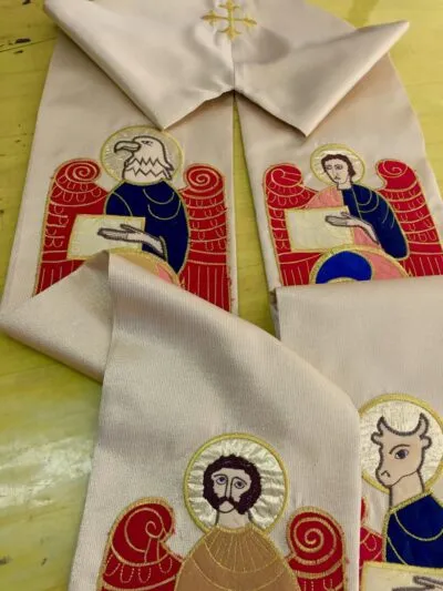 La estola de los cuatro evangelistas es una prenda litúrgica que simboliza la autoridad y el mensaje de los evangelistas Mateo, Marcos, Lucas y Juan. Cada uno de ellos es representado por un símbolo que refleja su carácter y la esencia de su evangelio.