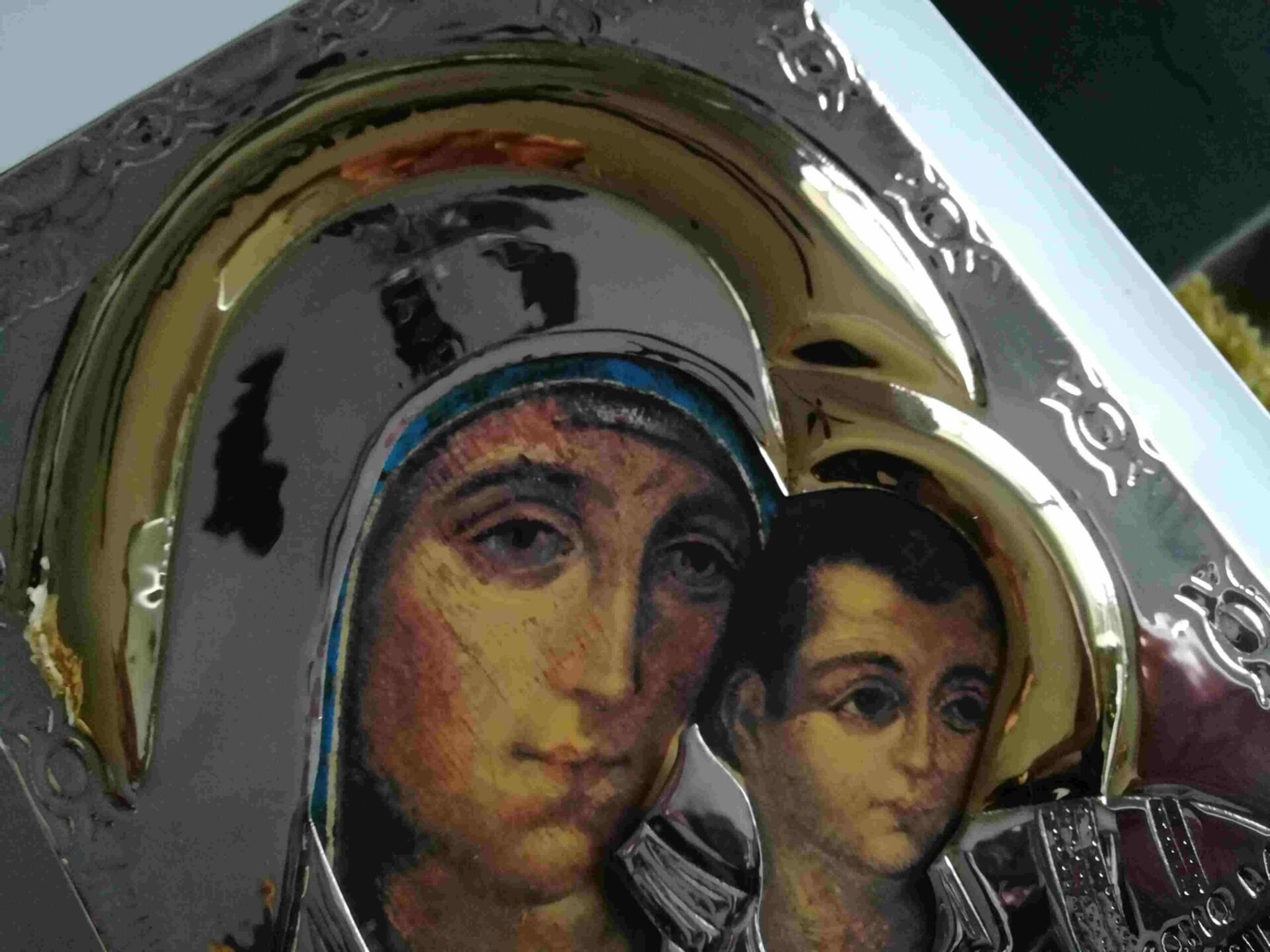 Icono de la Virgen cincelada a mano en plata de Ley y baño de Oro de 22K
