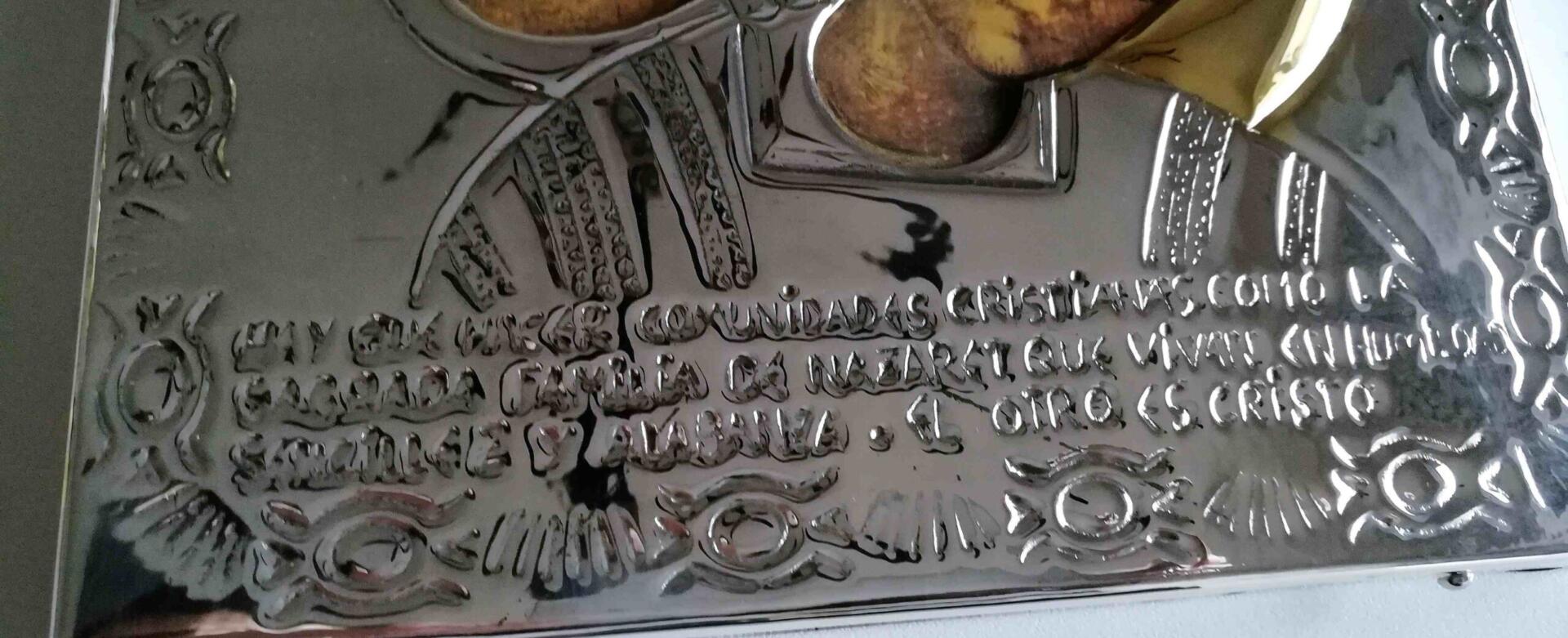 Orfebrería española. Cincelado a mamo con texto: Hay que hacer comunidades cristianas…..