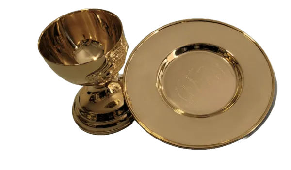 Juego compuesto por Cáliz presidencial del cordero liso pequeño Tamaño 13cm altura. Base cáliz 10cm. Diámetro copa 9cm. Profundidad copa 6cm