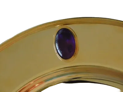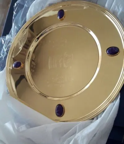 La Patena Presidencial con Piedras es una pieza de orfebrería litúrgica diseñada para realzar la solemnidad de las celebraciones eucarísticas. Esta patena destaca por su elegante acabado en baño de oro y la incorporación de piedras semipreciosas, aportando un toque de distinción y reverencia al rito sagrado.